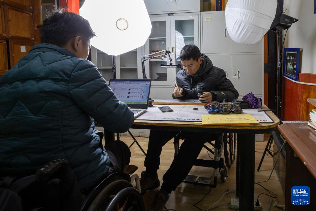 西藏拓崗文化傳播有限公司員工拉巴頓珠(左)與主播索朗德吉合作直播銷售藏語學(xué)習(xí)文具(11月10日攝)。新華社記者 姜帆 攝