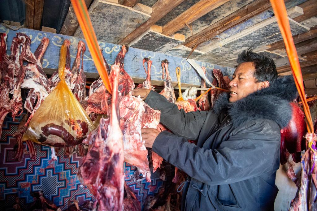 12月18日,嘎瑪熱杰在家中倉(cāng)庫(kù)里檢查過(guò)冬肉食。新華社記者劉文博 攝