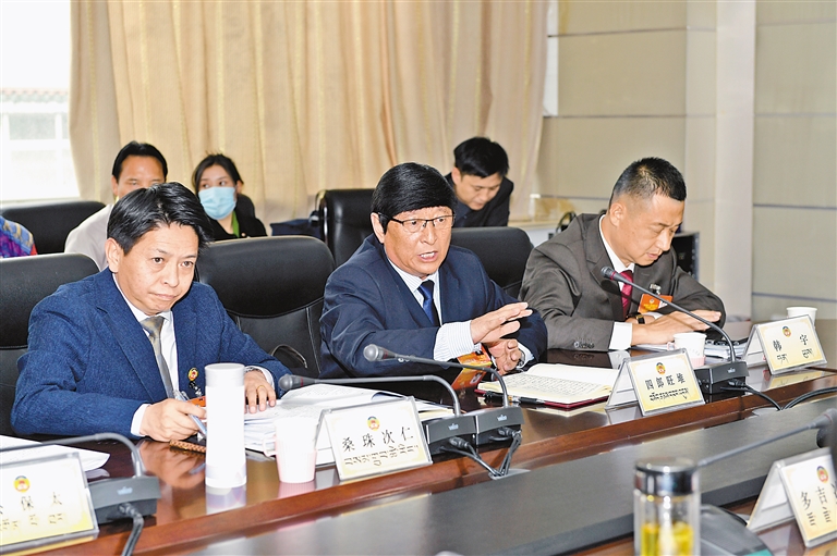 工商業(yè)聯(lián)合會界別的政協(xié)委員四郎旺堆(右)在發(fā)言。記者 旦增蘭澤 攝
