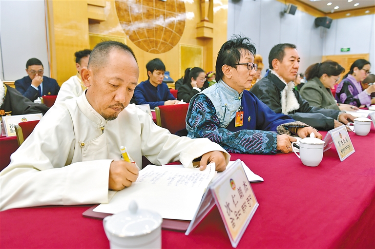 委員們認真聆聽政協(xié)常委會工作報告。 記者 洛桑 攝