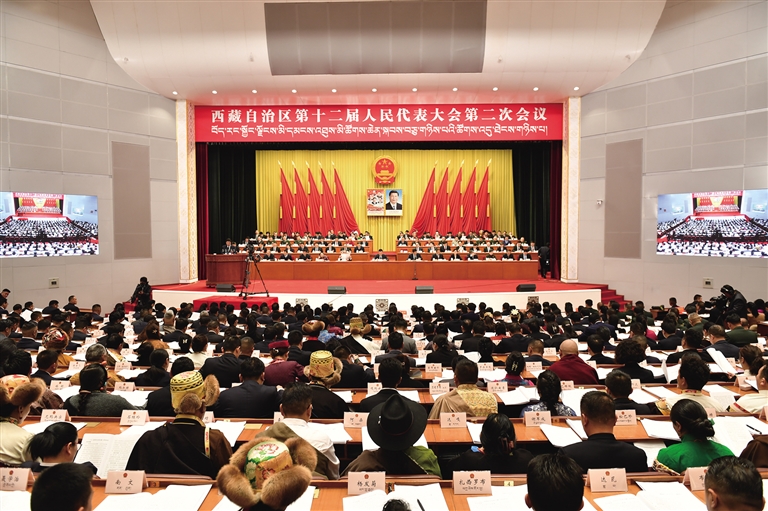 西藏自治區(qū)十二屆人大二次會(huì)議開幕現(xiàn)場?!∮浾摺〈稳势酱搿z