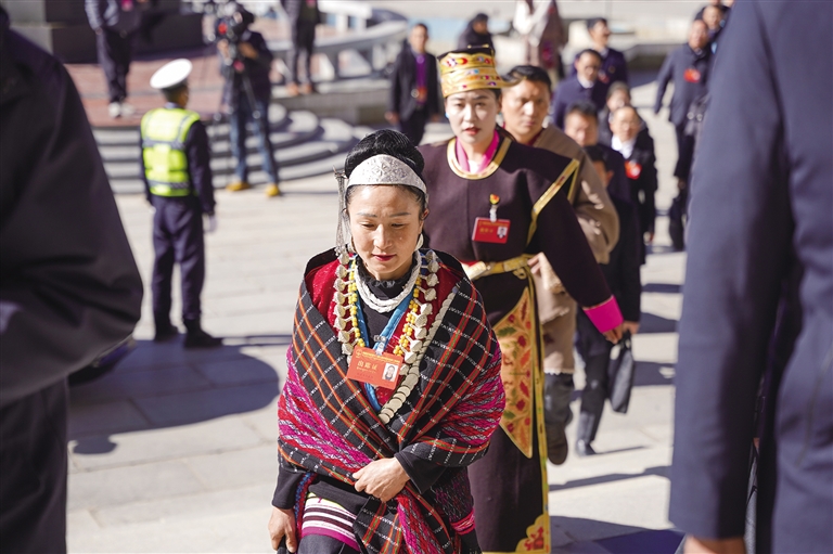 身著民族服飾的人大代表步入閉幕會(huì)場(chǎng)。