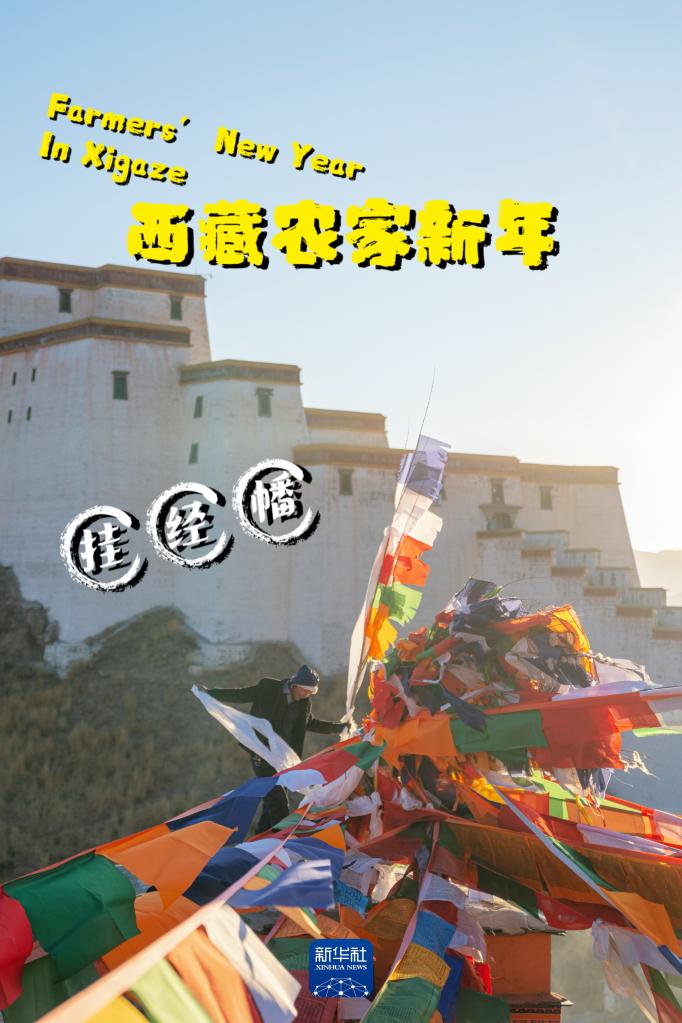 農(nóng)家新年大年初三,日喀則市桑珠孜區(qū)藏族群眾沿襲傳統(tǒng),清晨在山頂和自家屋頂上豎起嶄新的經(jīng)幡,祈愿新的一年國泰民安(1月14日攝)。
