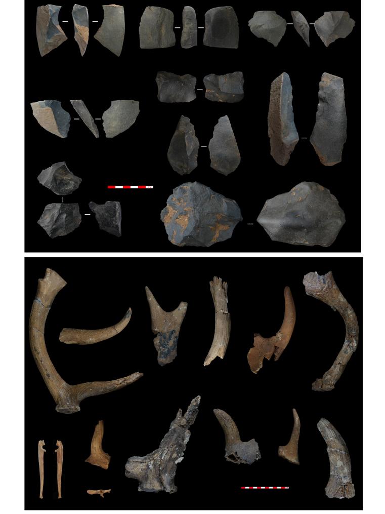 第一期遺存——石制品(上);第一期遺存——?jiǎng)游锘ㄏ拢?。(資料圖片由中國科學(xué)院古脊椎動(dòng)物與古人類研究所提供)
