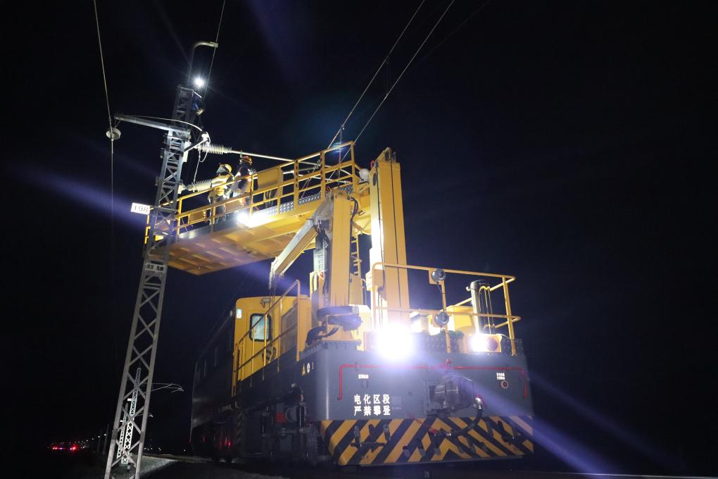 維護(hù)進(jìn)行時(shí),專用的接觸網(wǎng)軌道作業(yè)車的兩節(jié)車廂緩緩解列,分別駛向全長13公里的接觸網(wǎng)作業(yè)區(qū)段兩端。拉薩的冬夜寒風(fēng)刺骨,溫度低至零下10攝氏度,工人們穿著絕緣鞋,將兩端接觸網(wǎng)接掛地線,正式開始作業(yè)。