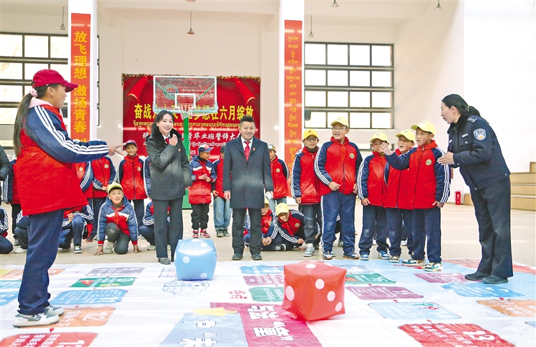 圖為3月5日,瓊結縣人民法院干警們在瓊結鎮(zhèn)完全小學用游戲方式開展“法治第一課”活動。倫珠澤仁 記者 洛桑 攝