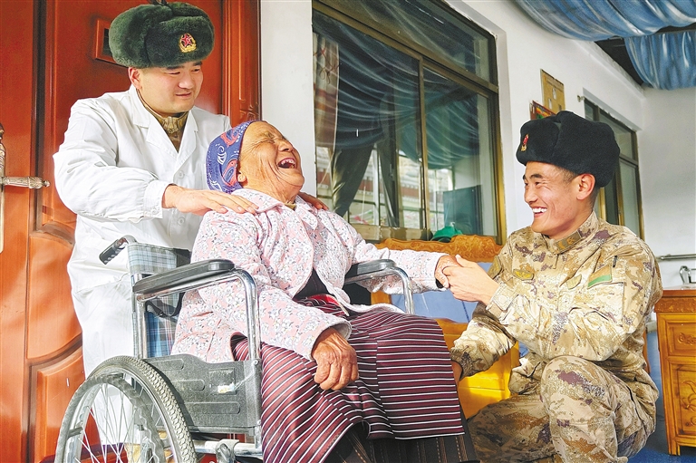 圖為3月5日,阿里軍分區(qū)某邊防團官兵走進養(yǎng)老院、駐地社區(qū),為老人們提供按摩、理發(fā)等志愿服務。劉曉東 記者 次仁平措 攝