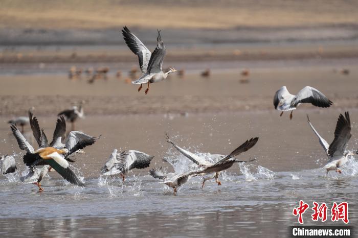 圖為斑頭雁、赤麻鴨在林周縣虎頭山水庫嬉戲。貢嘎來松 攝