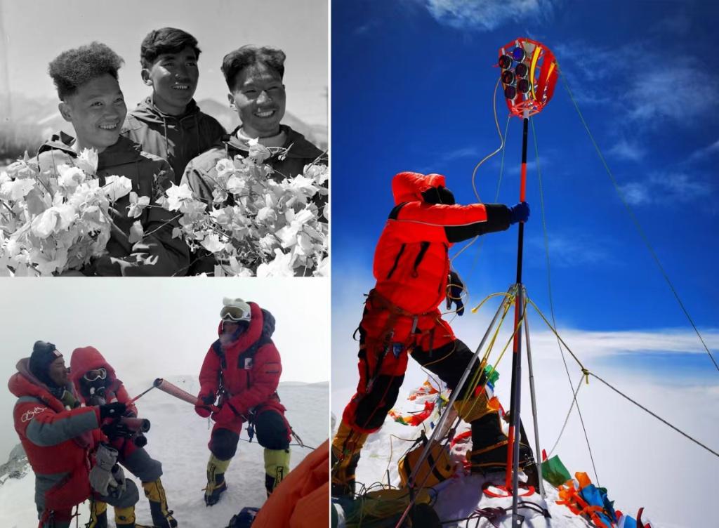 拼版照片:左上圖為1960年5月登上珠穆朗瑪峰峰頂?shù)闹袊?guó)登山隊(duì)隊(duì)員王富洲(右)、貢布(中)和屈銀華(資料照片,新華社發(fā));左下圖為2008年5月8日,北京奧運(yùn)圣火珠峰傳遞登山隊(duì)隊(duì)員羅布占堆(左)點(diǎn)燃第一棒火炬手吉吉手中的“祥云”火炬(新華社發(fā));右圖為2020珠峰高程測(cè)量登山隊(duì)隊(duì)員在珠穆朗瑪峰峰頂開展測(cè)量工作(2020年5月27日新華社特約記者扎西次仁攝)