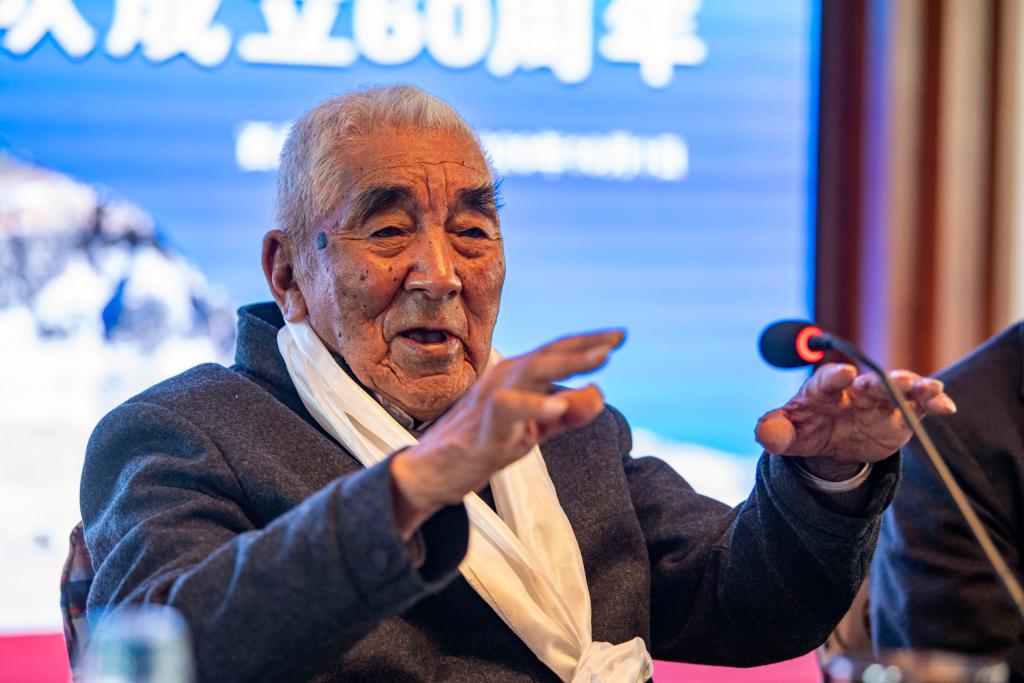 2020年10月1日,87歲高齡的老登山家貢布在慶祝中國(guó)西藏登山隊(duì)成立60周年活動(dòng)上致辭。新華社記者 孫非 攝