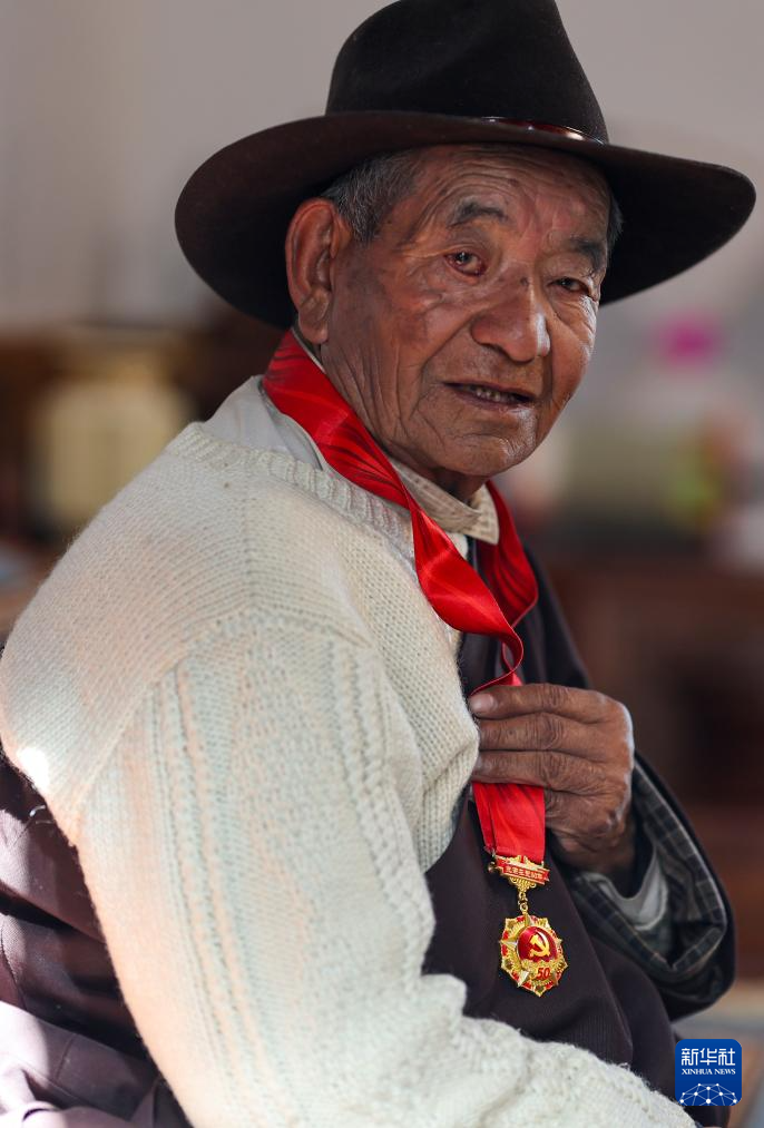 80歲的扎巴旺旦老人展示自己的“光榮在黨50年”紀(jì)念章(3月11日攝)。新華社記者 姜帆 攝