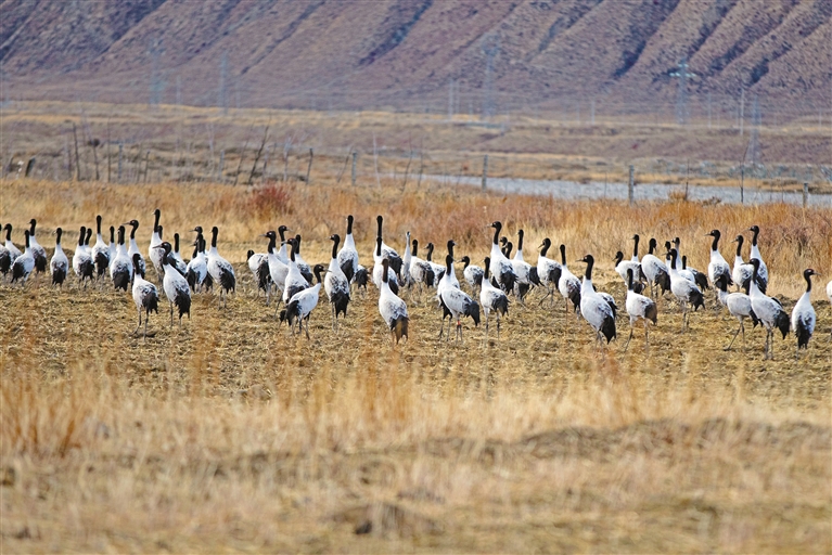 黑頸鶴在墨竹工卡縣唐加鄉(xiāng)拉東村農田里棲息。