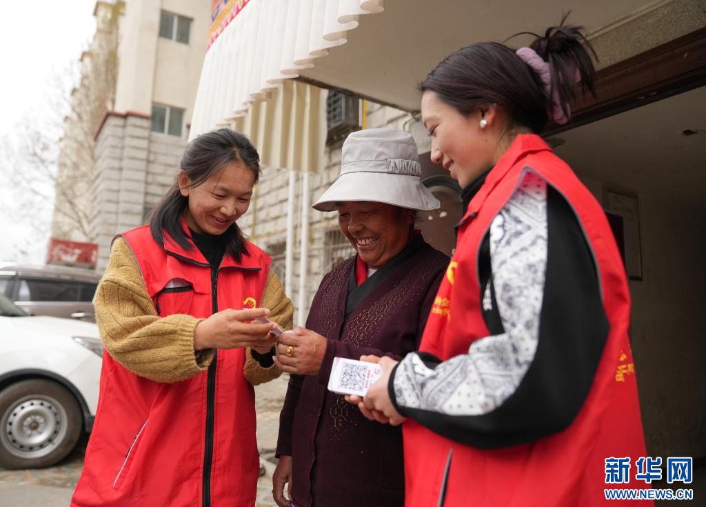 4月2日,納金村居民和工作人員為網格便民二維碼點贊。(新華社記者 晉美多吉 攝)