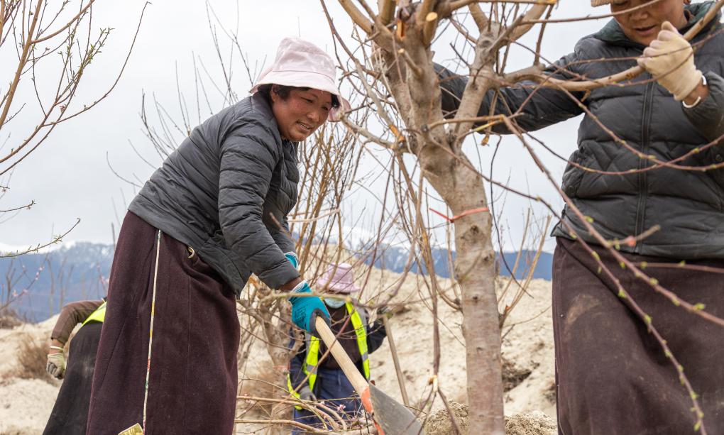“這里以后也會(huì)成為桃花園!”56歲的嘎拉村村民尼瑪曲吉說(shuō)。在嘎拉村外尼洋河的河灘上,她和村民們正在種桃樹,挖坑、正苗、培土,累了就唱幾句藏歌。聽(tīng)到記者叫了一聲“阿佳”(藏語(yǔ)大姐之意),尼瑪曲吉熱情招手。
