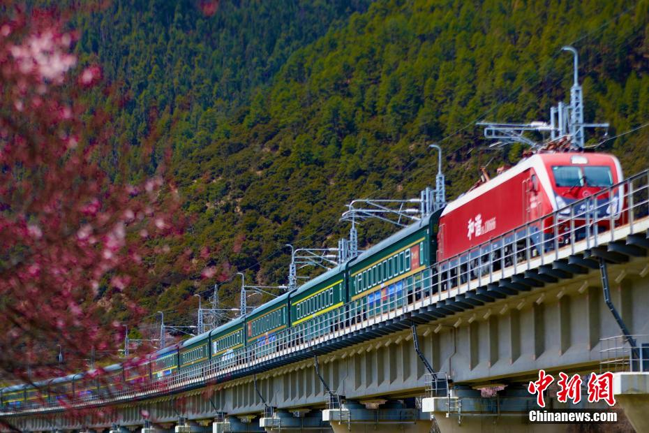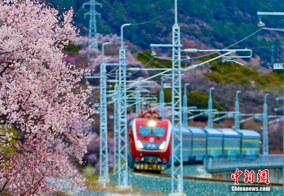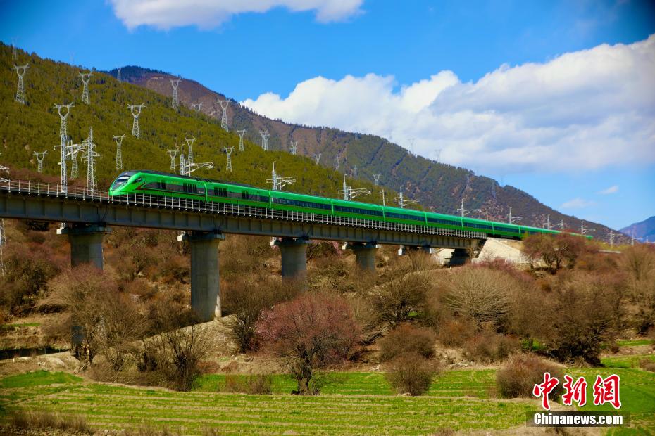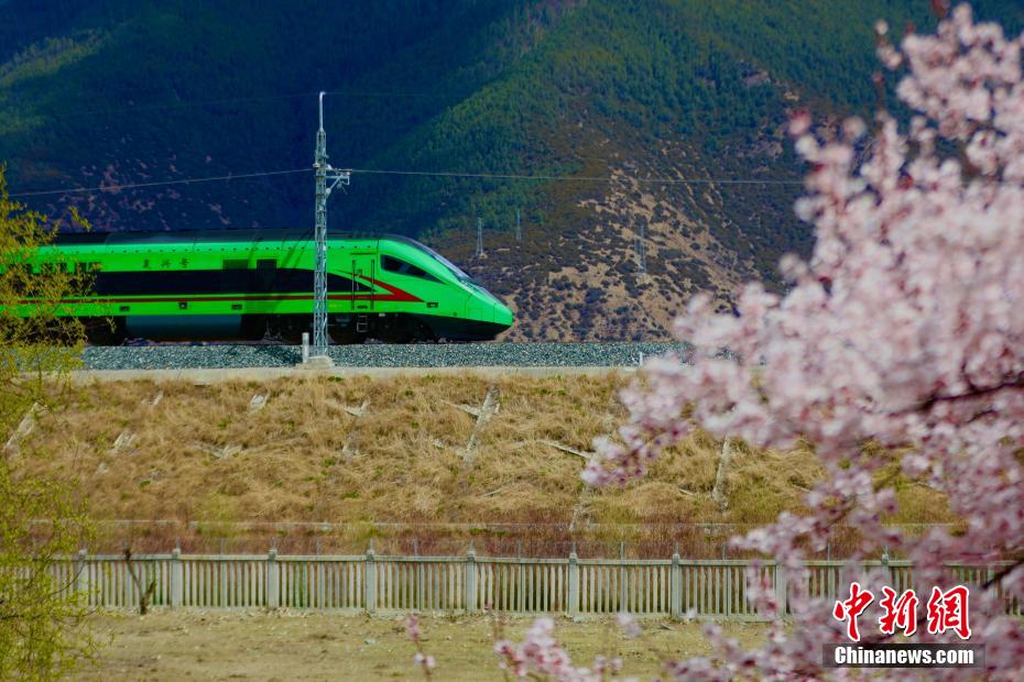 被譽(yù)為新“天路”的拉林鐵路,是中國(guó)首條高原電氣化鐵路,于2021年6月25日開(kāi)通運(yùn)營(yíng),結(jié)束了西藏東南地區(qū)不通鐵路的歷史。圖為拉林鐵路沿線桃花盛開(kāi),與飛馳而過(guò)的動(dòng)車構(gòu)成別樣風(fēng)景圖。馬生明 攝