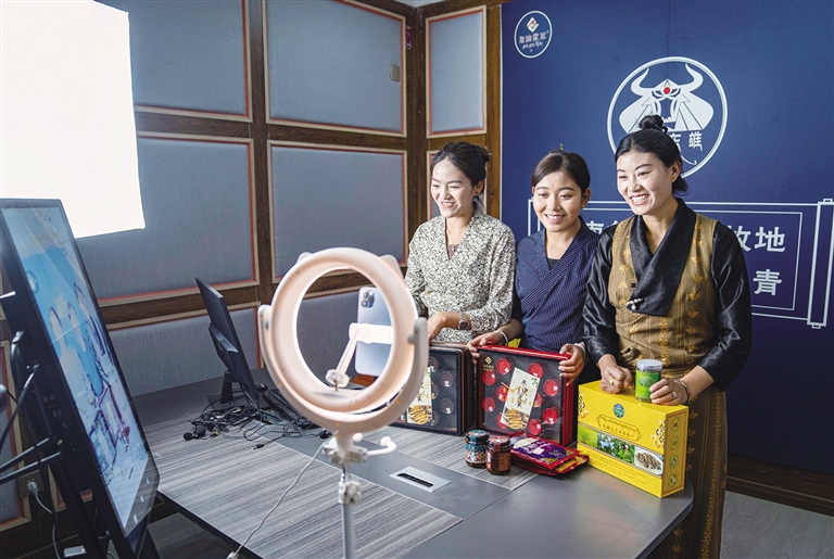 網(wǎng)絡主播在巴青縣“赤堆東雄”網(wǎng)紅直播間推介當?shù)靥厣r(nóng)牧產(chǎn)品?!⌒氯A社記者 孫非 攝