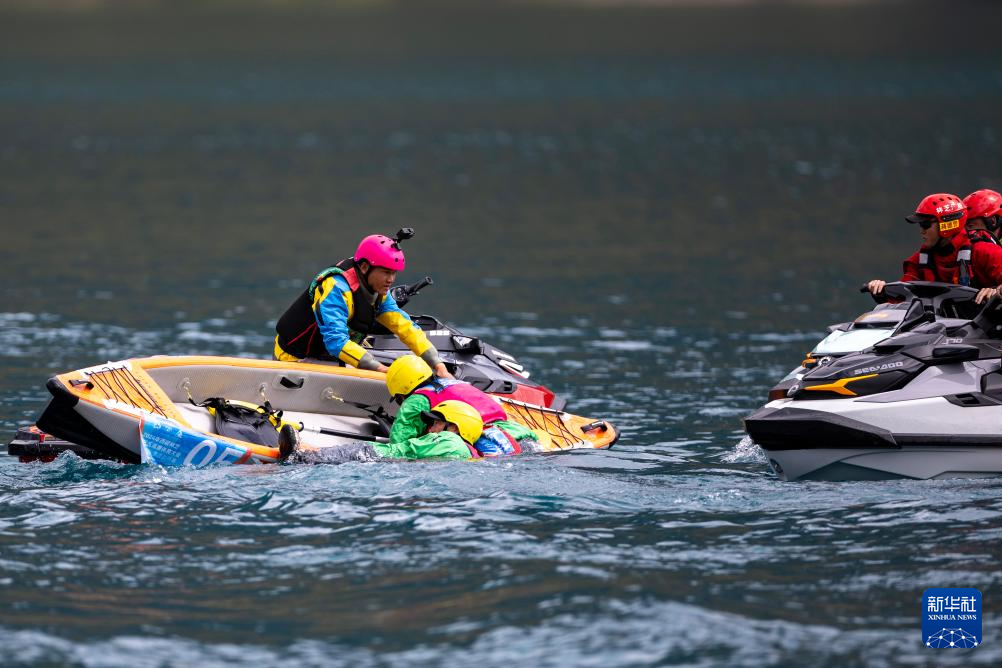 4月20日,救援人員在兩人漂流艇競速賽比賽中救起落水的“漂流雜多”隊選手。新華社記者 姜帆 攝