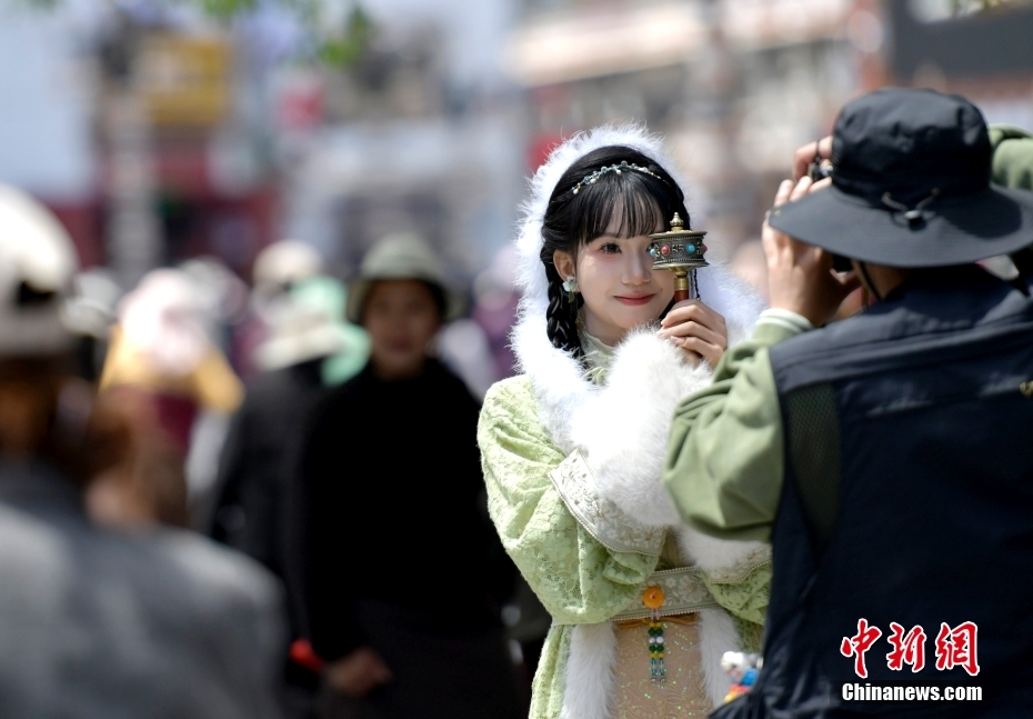 4月23日,身著藏裝的游客在拉薩八廓街拍照留念。隨著西藏旅游旺季臨近,中外游客來(lái)到雪域高原觀光旅游。中新社記者 李林 攝