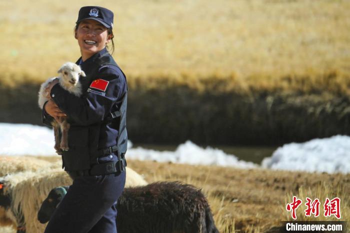 圖為日土邊境派出所民警抱著牧民的羊羔一起轉(zhuǎn)場。任博 攝