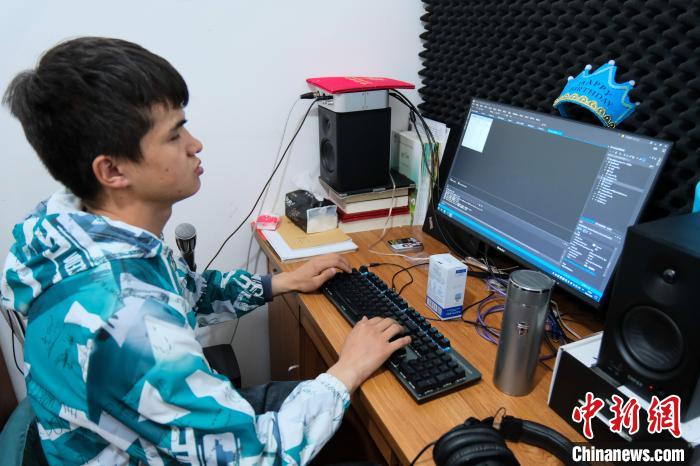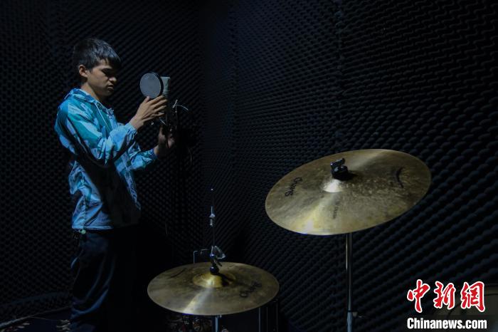 4月28日,尼瑪平措在公司的小錄音棚內(nèi)調(diào)整錄音設(shè)備,他們團隊可以提供歌曲錄制服務(wù)。中新社記者 江飛波 攝