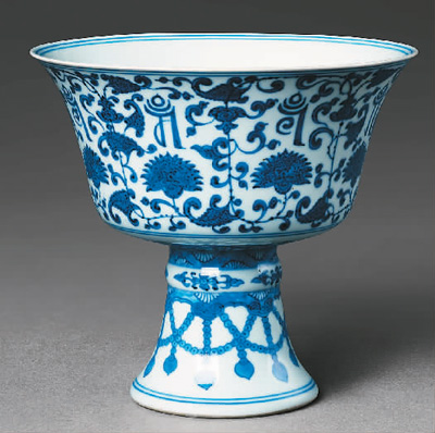 清代青花纏枝蓮托梵文紋高足供碗。中國大運河博物館供圖