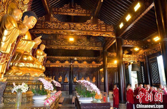 參觀結(jié)束后,少年活佛們返回主殿,在釋迦牟尼佛像前敬獻(xiàn)哈達(dá),同寬嚴(yán)法師一起誦經(jīng),共同祈愿國泰民安、世界和平。