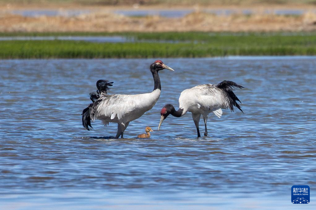 6月9日,一對黑頸鶴夫婦帶著雛鳥在西藏那曲市申扎縣一處濕地棲息、覓食。新華社記者 晉美多吉 攝