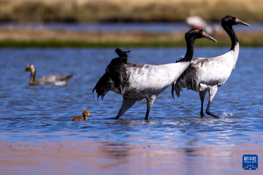 6月9日,黑頸鶴帶著雛鳥在西藏那曲市申扎縣一處濕地棲息、覓食。新華社記者 晉美多吉 攝