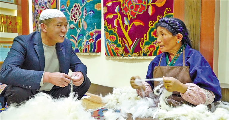 江孜縣組織開展民族文化、民族手工業(yè)、民族飲食、民族服裝等沉浸式體驗活動。這是回族群眾在體驗傳統(tǒng)服裝制作工序。