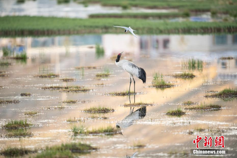 6月12日,西藏那曲市申扎縣一只黑頸鶴在濕地里覓食。申扎縣,平均海拔超過4500米,是黑頸鶴在中國的主要繁殖地之一。每年4月到6月,成群的黑頸鶴會來到這里,筑巢、孵化、養(yǎng)育下一代。近年來,為了保護這些珍貴的生靈,申扎縣采取了一系列措施,設(shè)立了監(jiān)測站,對黑頸鶴的棲息地進(jìn)行24小時監(jiān)控,確保它們的繁殖不受干擾。黑頸鶴是國家一級保護動物,也是世界上唯一一種生長、繁殖在高原的鶴類。貢嘎來松 攝