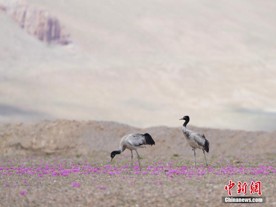 6月12日,西藏那曲市申扎縣黑頸鶴在花叢中覓食。申扎縣,平均海拔超過4500米,是黑頸鶴在中國的主要繁殖地之一。每年4月到6月,成群的黑頸鶴會來到這里,筑巢、孵化、養(yǎng)育下一代。近年來,為了保護這些珍貴的生靈,申扎縣采取了一系列措施,設(shè)立了監(jiān)測站,對黑頸鶴的棲息地進(jìn)行24小時監(jiān)控,確保它們的繁殖不受干擾。黑頸鶴是國家一級保護動物,也是世界上唯一一種生長、繁殖在高原的鶴類。貢嘎來松 攝