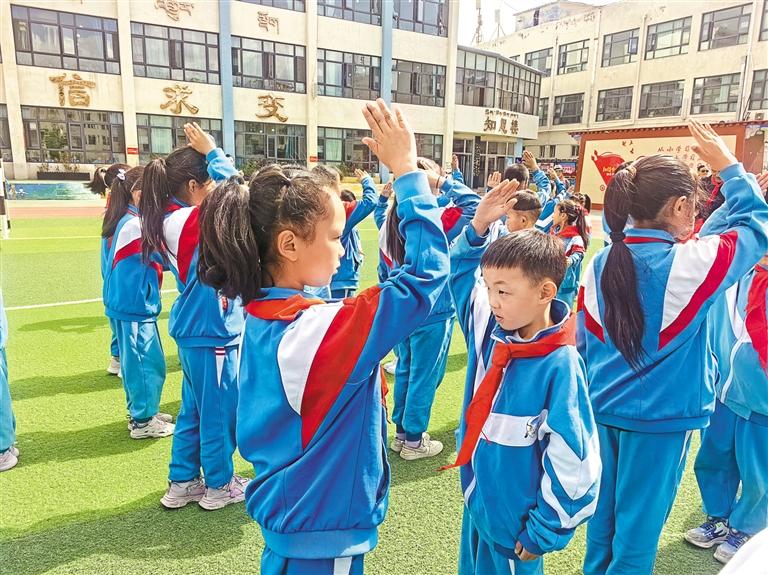 圖為新老少先隊(duì)員行禮。