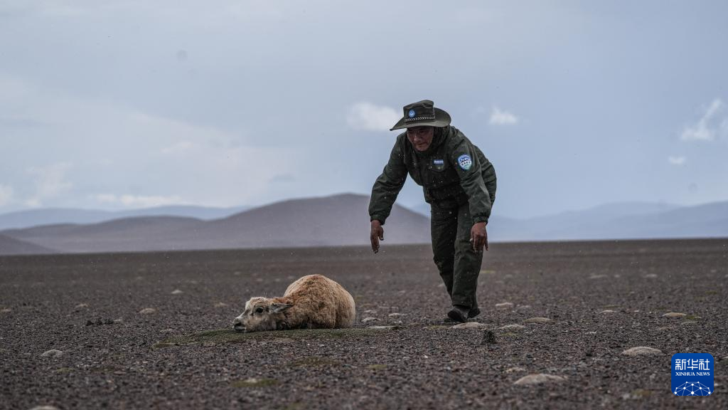羌塘國家級(jí)自然保護(hù)區(qū)的野保員在安撫受傷的母藏羚羊(6月14日攝)。新華社發(fā)(旦增攝)