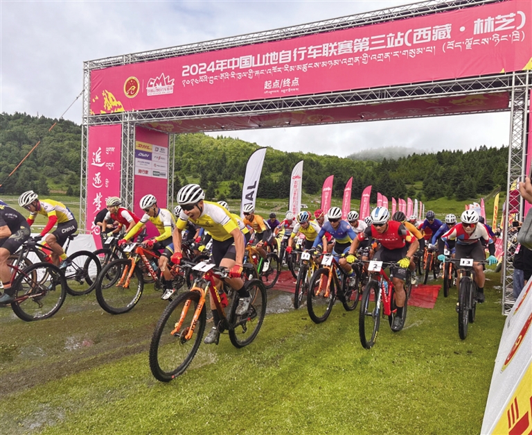 6月29日,2024年中國(guó)山地自行車聯(lián)賽第三站(西藏·林芝)在林芝市比日山國(guó)家森林公園天邊牧場(chǎng)開賽。來自全國(guó)各省、自治區(qū)、市的16支專業(yè)代表隊(duì),以及業(yè)余選手、自行車愛好者們一同角逐競(jìng)技。