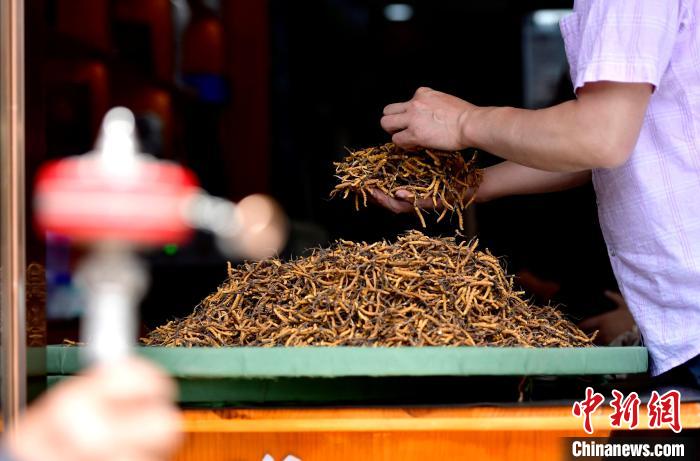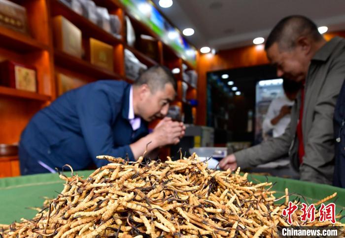 圖為7月16日,蟲草商張華平正在展示店內(nèi)的蟲草。中新社記者 李林 攝
