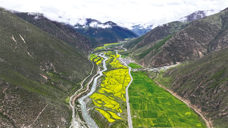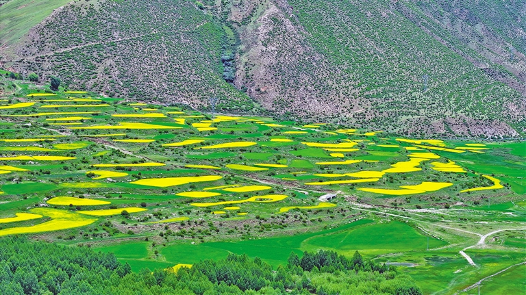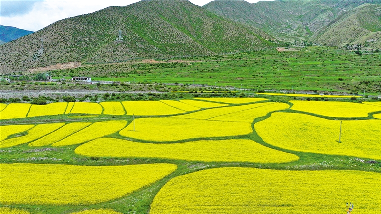 最近,墨竹工卡縣迎來(lái)了油菜花的盛開時(shí)節(jié)。放眼望去,滿目的油菜花如同金黃色的毯子般鋪展開來(lái),在微風(fēng)中搖曳,散發(fā)出迷人的香氣。一團(tuán)團(tuán)、一簇簇的金黃色花朵點(diǎn)綴在田野上,流動(dòng)著濃濃夏意。成片的花海與蜿蜒的農(nóng)村公路、錯(cuò)落有致的村居共同構(gòu)成了一幅和諧美麗的田園風(fēng)景圖。
