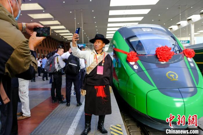資料圖為2021年6月25日,西藏拉林鐵路開(kāi)通運(yùn)營(yíng),拉薩曲水縣三有村村民次旦平措在復(fù)興號(hào)前拍照留念。記者 江飛波 攝