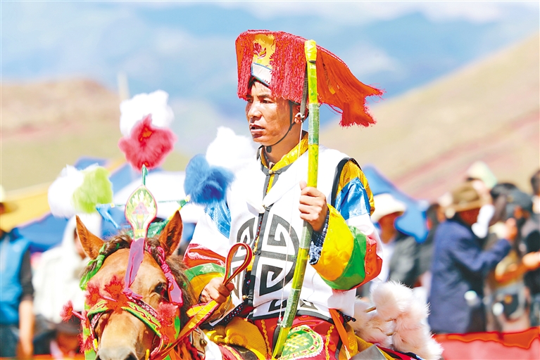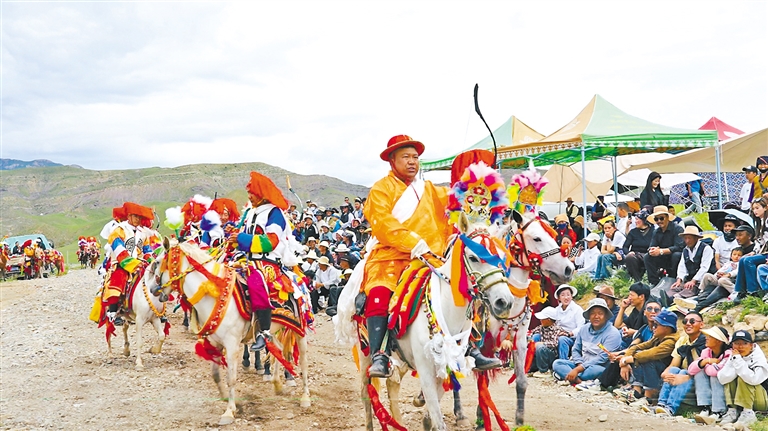 在邊交林鄉(xiāng)當杰村“望果節(jié)”活動現(xiàn)場,隨著激昂的《運動員進行曲》,當杰村“平措林望果節(jié)”活動拉開帷幕,38名馬術運動員、38名射箭運動員在2萬多名觀眾的歡呼聲中邁入現(xiàn)場。