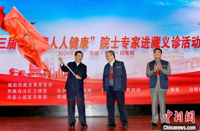 圖為第三屆“西藏人人健康”院士專家進(jìn)藏義診活動啟動儀式上,西藏自治區(qū)副主席甲熱·洛桑丹增(圖左)為義診專家團(tuán)隊代表授旗。李林 攝