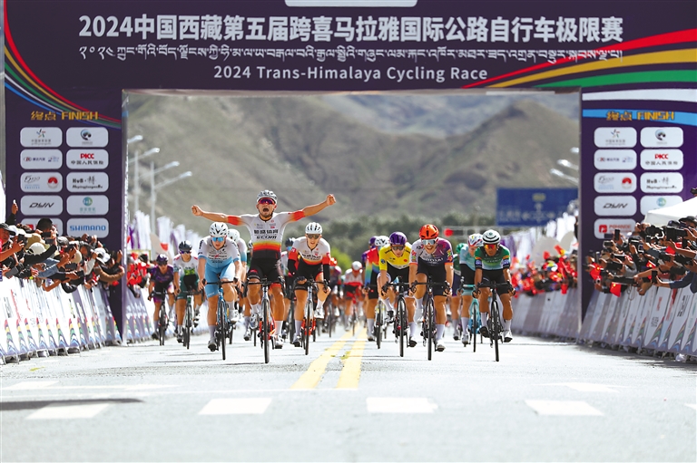 圖為運(yùn)動(dòng)員沖過日喀則賽段終點(diǎn)線。記者 扎西頓珠 楊子彥 攝