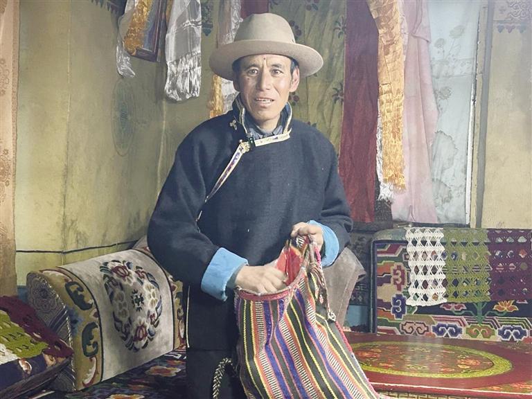 放牧巡邊途中的經(jīng)歷,格桑覺得只是日常的事情,并沒有什么值得講述的。不過,他也有特別珍視的東西。格桑特意走進(jìn)另一間屋子,捧出一個略顯舊色的布袋。他小心打開袋子,里面是他珍藏的一面面國旗。