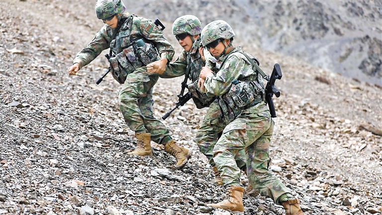 戰(zhàn)友們攙扶第一次巡邏的盧銳津。崔運(yùn)紅 攝