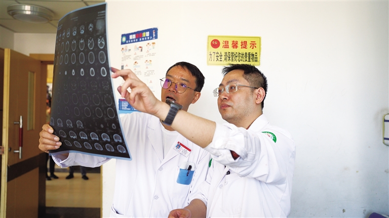 昌都市人民醫(yī)院外二科主任余正強(左)與重慶市第十批援藏干部、昌都市人民醫(yī)院神經(jīng)外科副主任熊偉茗(右)正在討論患者治療方案。