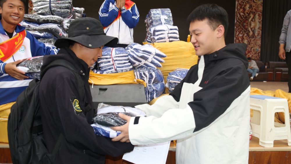 9月6日,中央民族大學(xué)第26屆研究生支教團(tuán)成員侯宇航(右)為拉薩那曲第二高級(jí)中學(xué)報(bào)到新生發(fā)放生活用品。(嘎瑪曲宗 攝)