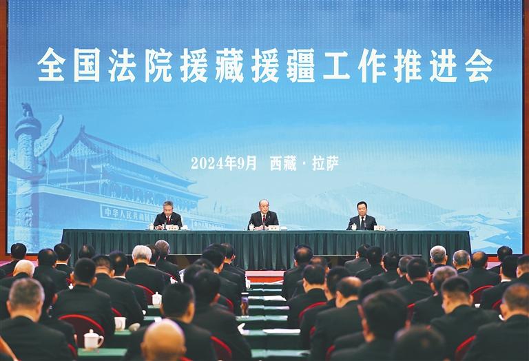 張軍強(qiáng)調(diào),對口援藏援疆重在“對口”。要扭住對口援藏援疆的關(guān)鍵點(diǎn)精準(zhǔn)發(fā)力。要錨定受援地區(qū)戰(zhàn)略定位和改革發(fā)展所需,通過審判業(yè)務(wù)援助促進(jìn)提質(zhì)增效,提升法院服務(wù)大局的能力水平。要以雙贏多贏共贏的理念做優(yōu)人才智力援助,選派優(yōu)秀年輕干部到受援地區(qū)接受磨礪、增長才干,帶動(dòng)受援法院法官能力素質(zhì)提升。要把提高政治能力作為教育培訓(xùn)援助的根本,把習(xí)近平法治思想作為“綱”和“魂”,用好法答網(wǎng)、人民法院案例庫、中國法官培訓(xùn)網(wǎng),以“定制式”“菜單式”教育培訓(xùn)提升實(shí)用性、實(shí)效性。要把中華民族共同體意識(shí)融入文化生活援助中,融入受援法院審判執(zhí)行工作中,在潤物無聲中打牢民族團(tuán)結(jié)的思想和文化基礎(chǔ)。要統(tǒng)籌軟硬件建設(shè)和數(shù)據(jù)思維提升,通過信息化建設(shè)援助為受援法院發(fā)展提供強(qiáng)勁動(dòng)能。要堅(jiān)持開源節(jié)流并舉,加大物資裝備援助力度,嚴(yán)格管理、科學(xué)使用,確保每一分錢都用在刀刃上、發(fā)揮最大效能。
