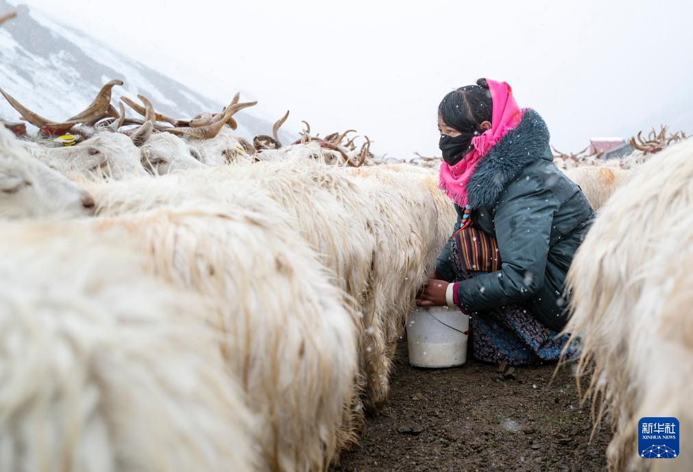 9月13日,在日土縣龍門卡村白絨山羊擴(kuò)繁場,飼養(yǎng)員給白絨山羊擠奶。新華社記者 孫瑞博 攝