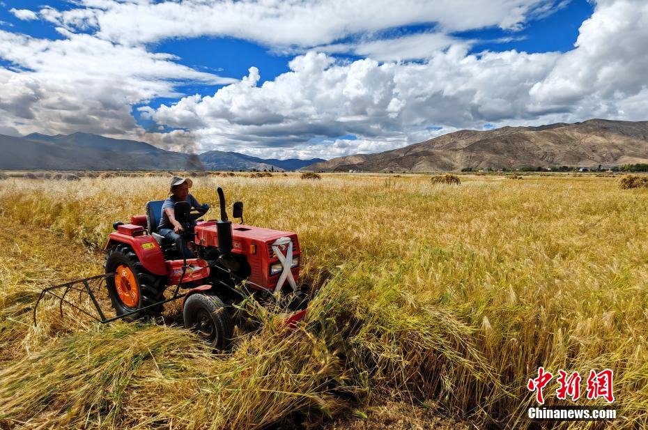 圖為9月14日,日喀則市白朗縣村民駕駛收割機(jī)收青稞。中新社記者 李林 攝