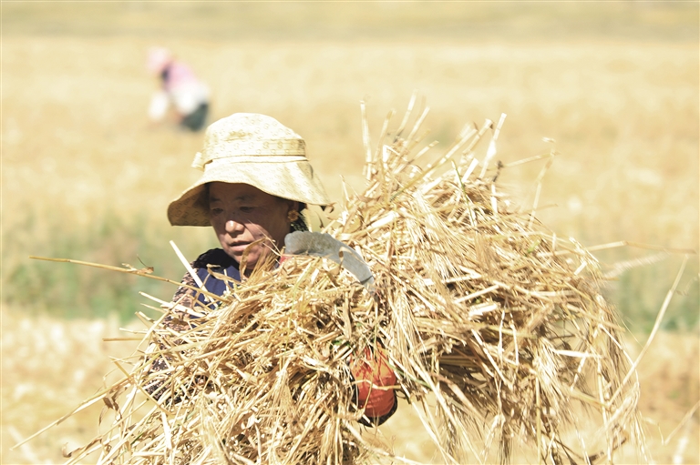 金秋九月,風(fēng)吹麥浪、穗粒飽滿,連日來(lái),在墨竹工卡縣金黃色的農(nóng)田里,處處可見(jiàn)勤勞的農(nóng)民們搶抓時(shí)機(jī),開(kāi)展小油菜和青稞收割、晾曬、搬運(yùn)、儲(chǔ)藏,確保糧食顆粒歸倉(cāng)。