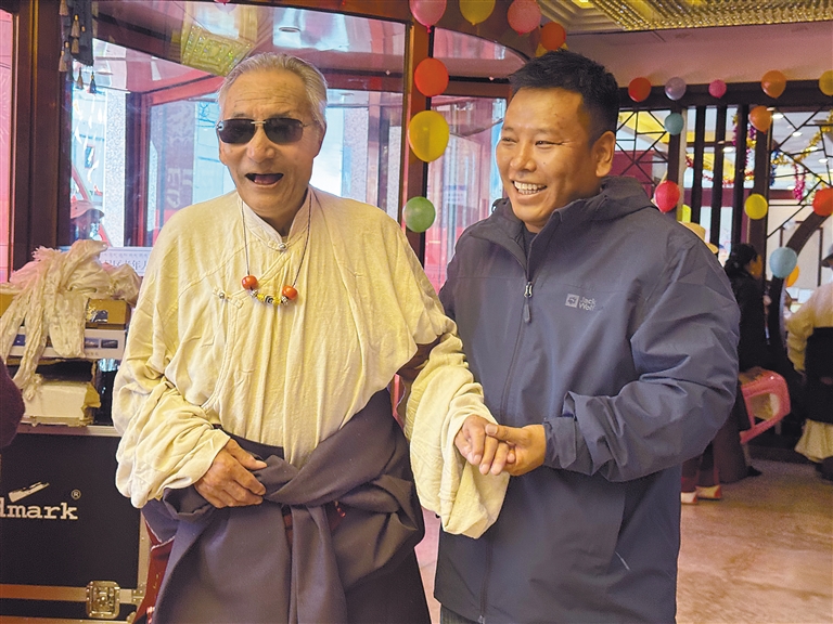旦巴益西在一群老人中格外顯眼,身著節(jié)日盛裝,頭發(fā)近乎全白,思維敏捷,談吐清晰,一雙透亮的眼眸蘊藏著溫暖的笑意,爽朗的笑聲特別有感染力……整個人看起來精神矍鑠。