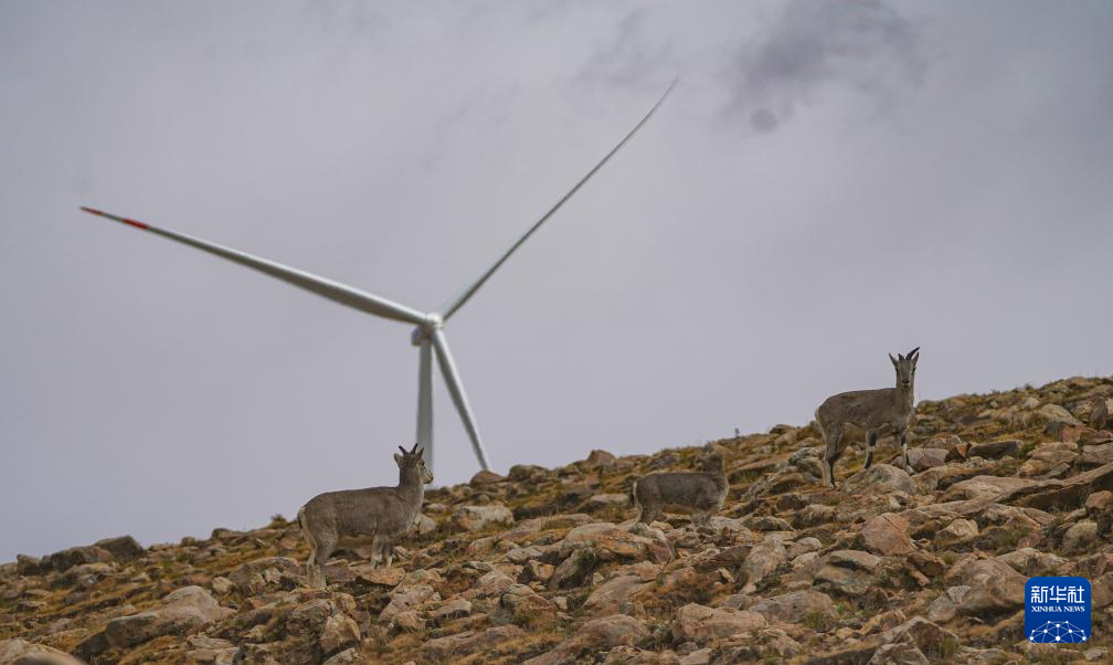 10月17日拍攝的位于西藏日喀則市薩迦縣的風(fēng)力發(fā)電機組及周圍山上的野生動物。新華社記者 晉美多吉 攝??